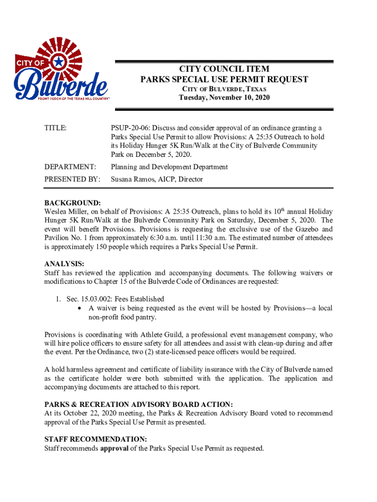 CITY COUNCIL ITEM PARKS SPECIAL USE PERMIT REQUEST CITY OF VALVERDE, TEXAS Tuesday, November 10, 2020TITLE:PSUP2006: Discuss and consider approval of an ordinance granting a Parks Special Use Permit