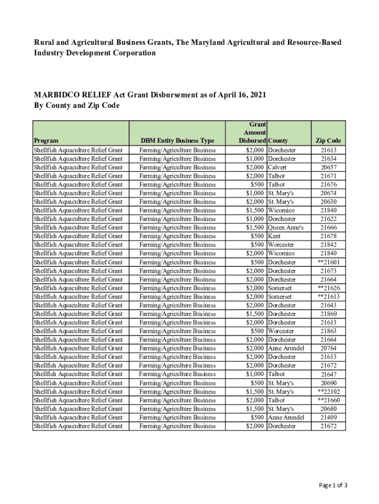 Rural and Agricultural Business Grants, The Maryland Agricultural and ResourceBased Industry Development CorporationMARBIDCO RELIEF Act Grant Disbursement as of April 16, 2021, By County and Zip Deprogram