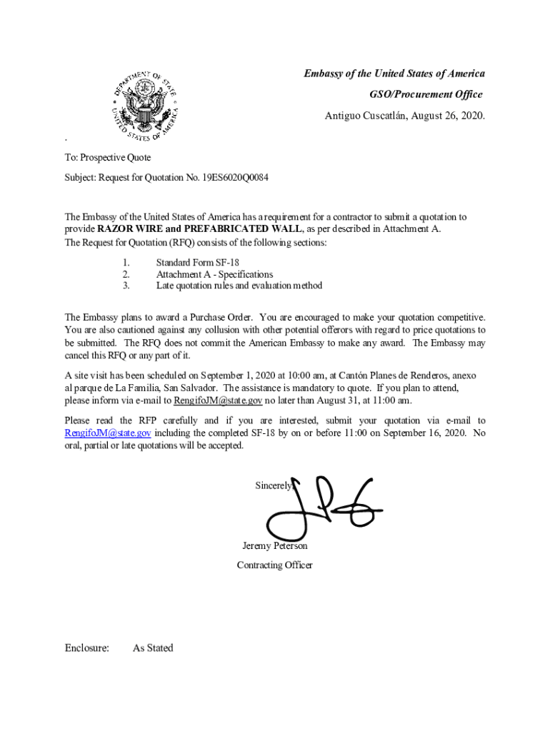 Embassy of the United States of America GSO/Procurement Office Antigua Muscat, August 26, 2020. . To: Prospective Quote Subject: Request for Quotation No. 19ES6020Q0084The Embassy of the United States