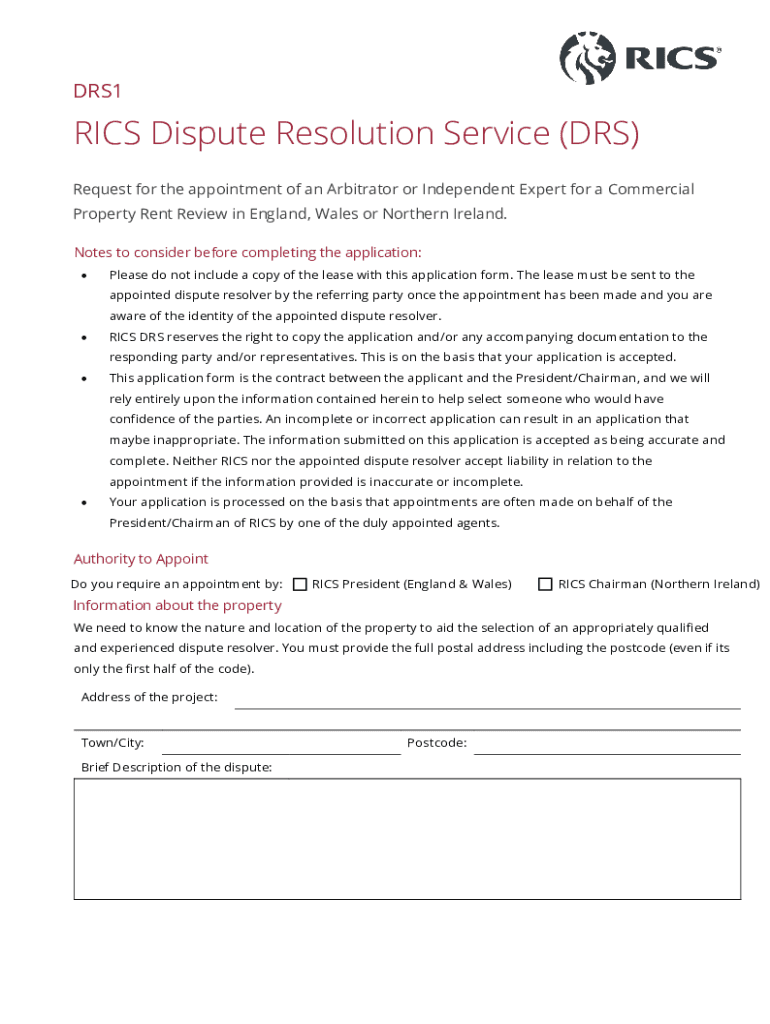 DRS1RICS Dispute Resolution Service (DRS) Request for the appointment of an Arbitrator or Independent Expert for a Commercial Property Rent Review in England, Wales or Northern Ireland. Notes to consider