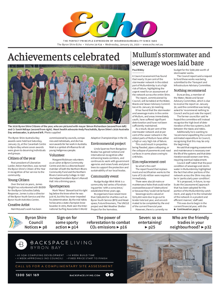 THE PERFECT PRINCIPLE EXPRESSION OF INSURMEASUREABILITY SINCE 1986The Byron Shire Echo Volume 34 ×34 Wednesday, January 29, 2020 www.echo.net.auMullums stormwater and sewerage woes laid bareAchievements