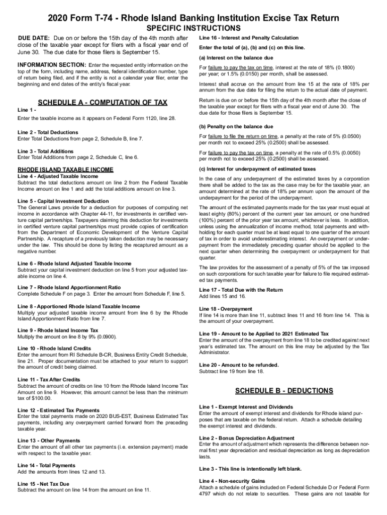 2020 Form T74 Rhode Island Banking Institution Excise Tax Return SPECIFIC INSTRUCTIONS DUE DATE: Due on or before the 15th day of the 4th month after close of the taxable year except for filers with