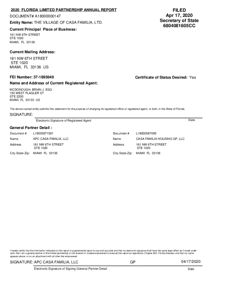 2020 FLORIDA LIMITED PARTNERSHIP ANNUAL REPORTED Apr 17, 2020 Secretary of State 6804081605CCDOCUMENT# A18000000147 Entity Name: THE VILLAGE OF CASA FAMILIAR, LTD. Current Principal Place of Business: