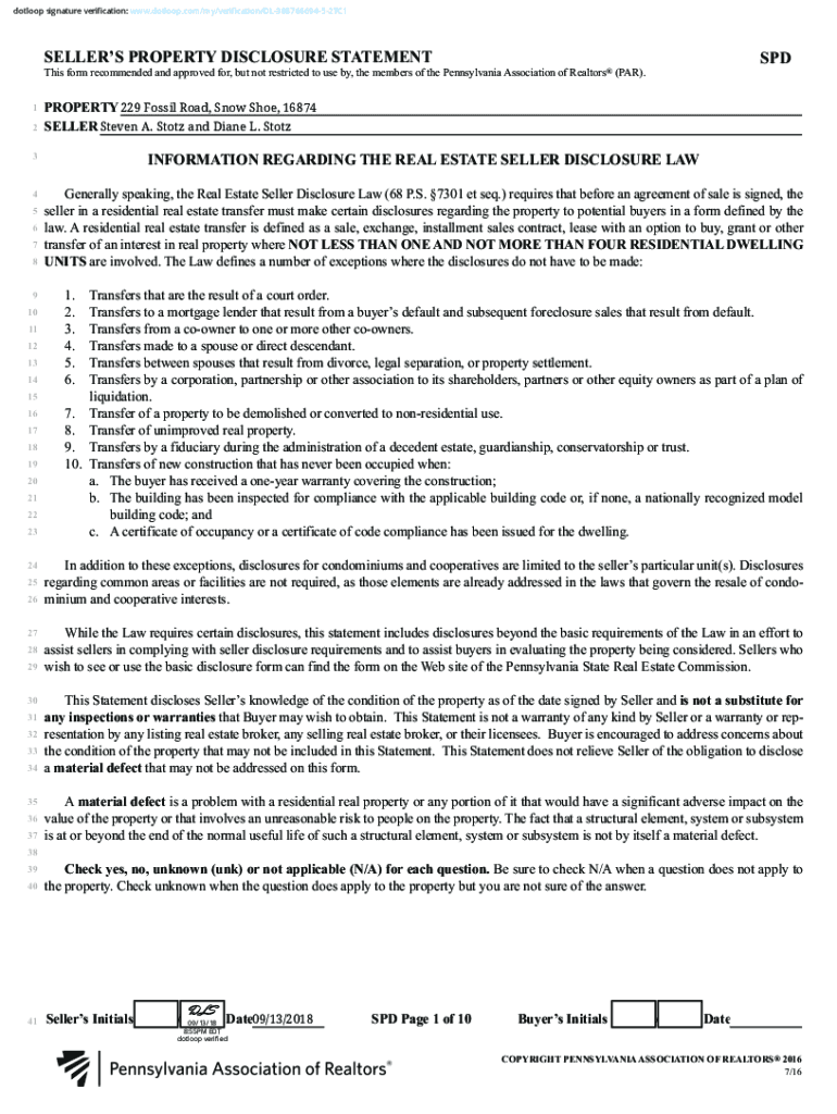 Dot loop signature verification: www.dotloop.com/my/verification/DL38876669452TC1SELLERS PROPERTY DISCLOSURE Statements form recommended and approved for, but not restricted to use by, the members