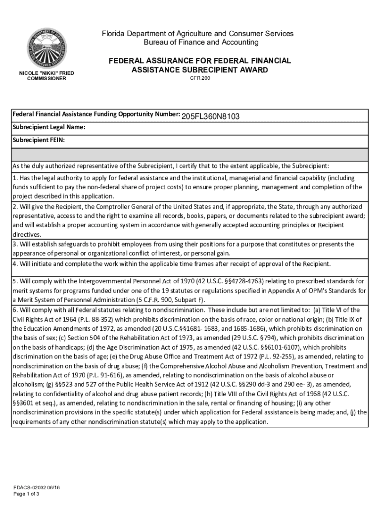 Florida Department of Agriculture and Consumer Services Bureau of Finance and Accounting NOTICE OF FEDERAL FINANCIAL ASSISTANCE FUNDING OPPORTUNITY REQUEST FOR APPLICATIONS NICOLE NIKKI FRIED COMMISSIONER