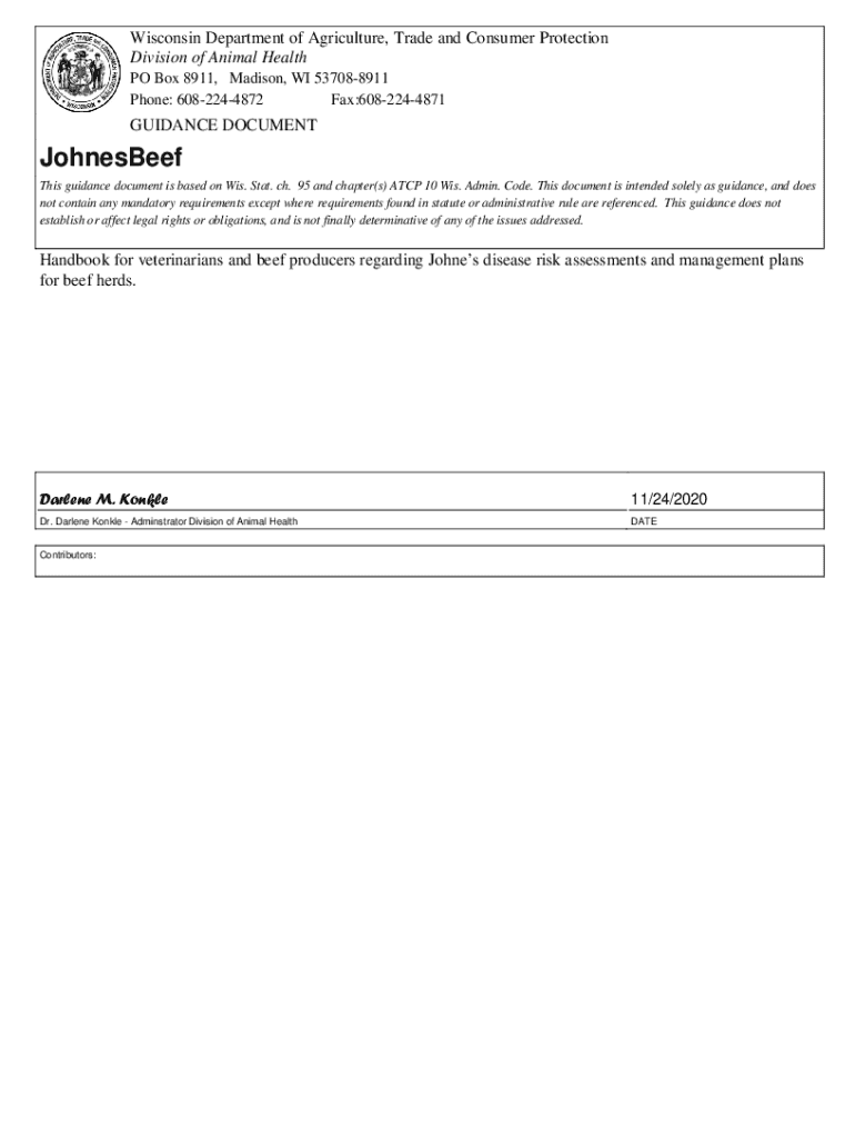 Wisconsin Department of Agriculture, Trade and Consumer Protection Division of Animal Health PO Box 8911, Madison, WI 537088911 Phone: 6082244872 Fax:6082244871GUIDANCE DOCUMENTJohnesBeef This guidance