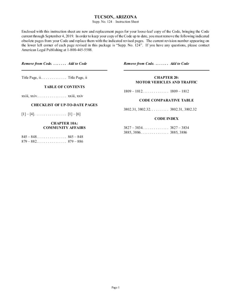 TUCSON, ARIZONA Supp. No. 124 Instruction SheetEnclosed with this instruction sheet are new and replacement pages for your loose-leaf copy of the Code, bringing the Code current through September