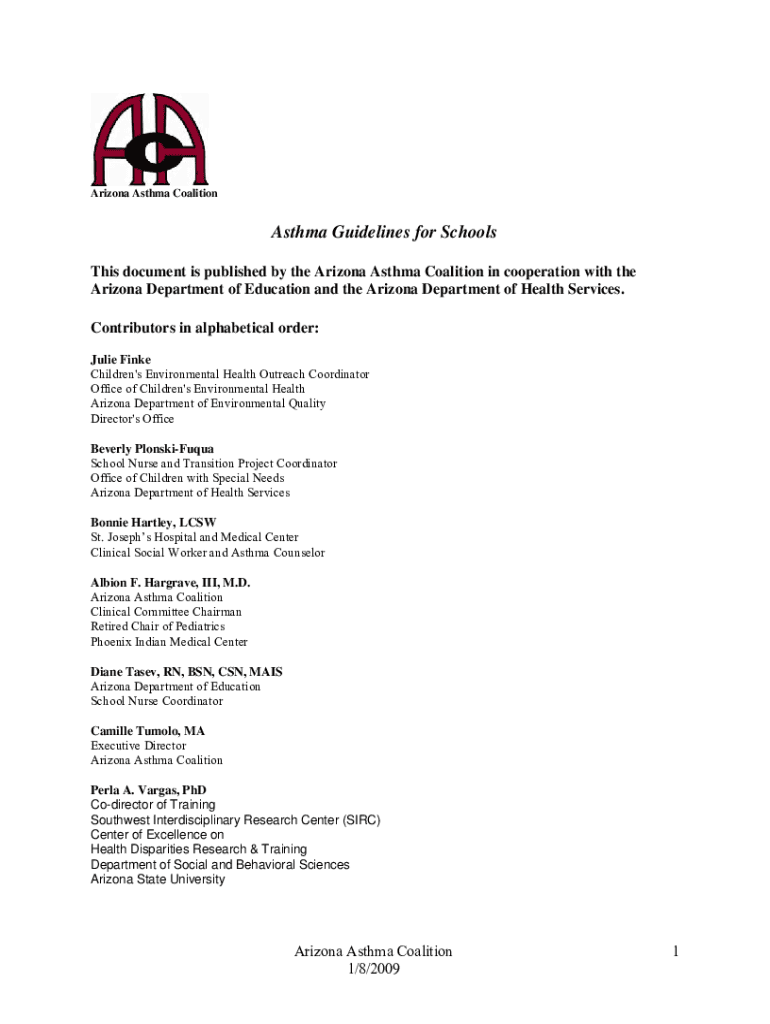 Arizona Asthma CoalitionAsthma Guidelines for Schools This document is published by the Arizona Asthma Coalition in cooperation with the Arizona Department of Education and the Arizona Department
