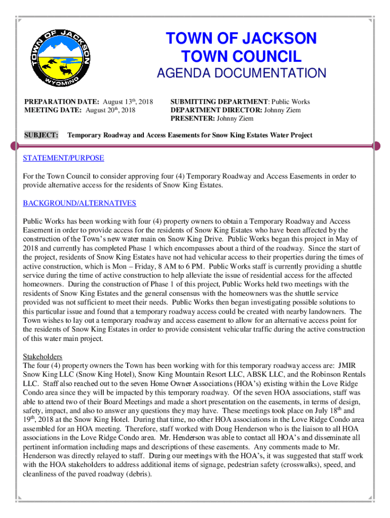 TOWN OF JACKSON TOWN COUNCIL AGENDA DOCUMENTATION PREPARATION DATE: August 13th, 2018 MEETING DATE: August 20th, 2018SUBJECT:SUBMITTING DEPARTMENT: Public Works DEPARTMENT DIRECTOR: Johnny Diem PRESENTER: