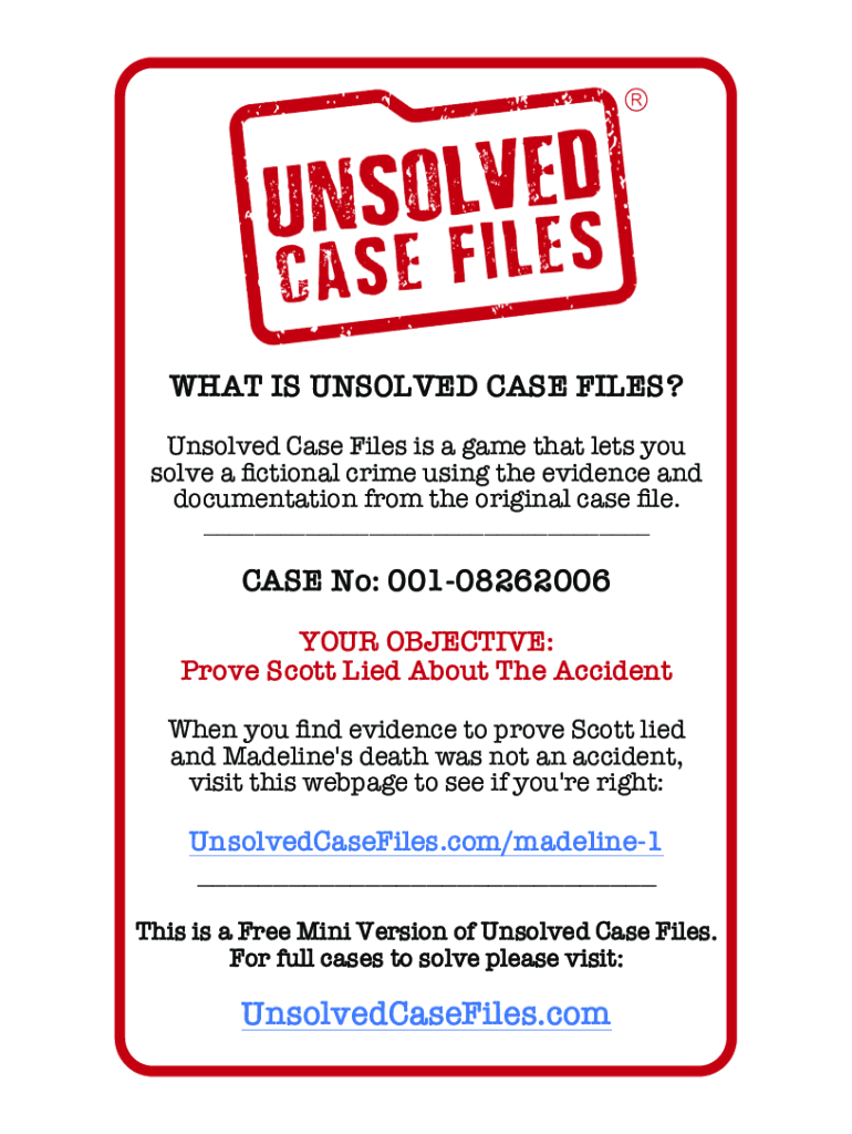 WHAT IS UNSOLVED CASE FILES? Unsolved Case Files is a game that lets you solve a fictional crime using the evidence and documentation from the original case file. ___CASE No: 00108262006 YOUR OBJECTIVE: