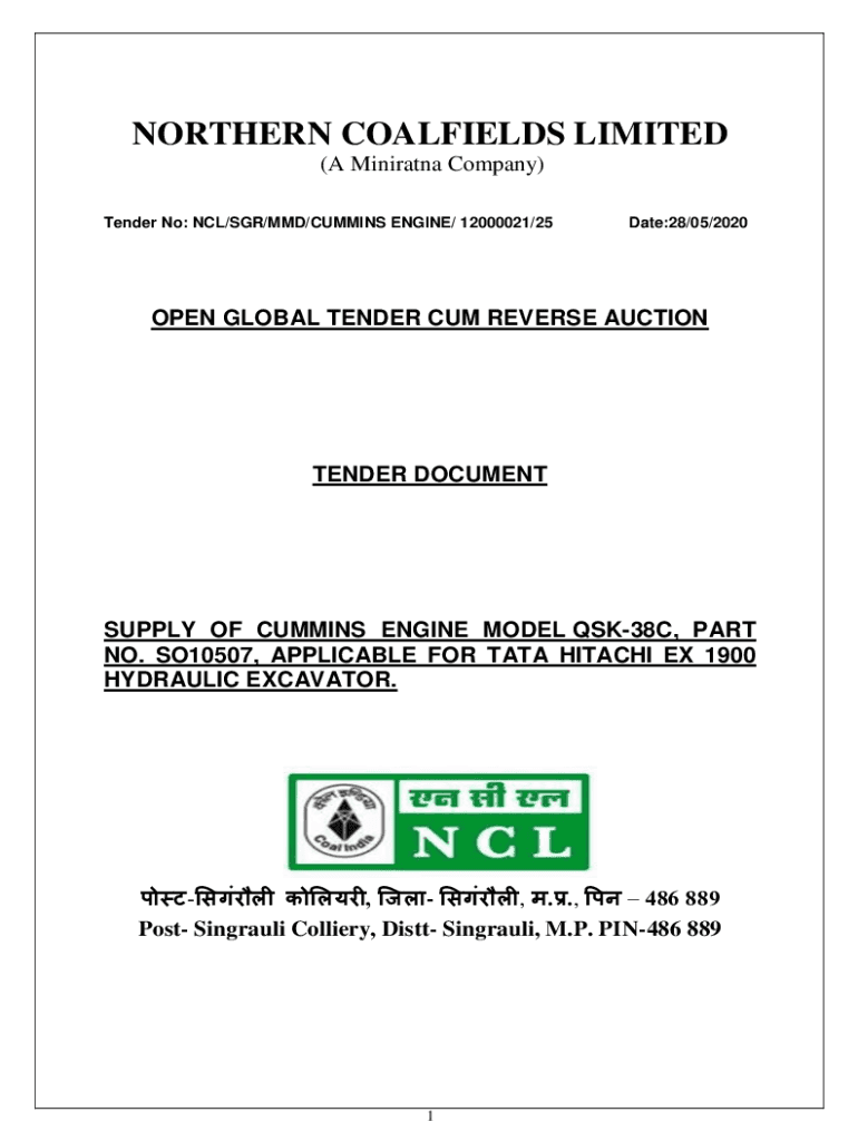 NORTHERN COALFIELDS LIMITED (A Minivan Company) Tender No: NCL/SGR/MID/CUMMINS ENGINE/ 12000021/25Date:28/05/2020OPEN GLOBAL TENDER Come REVERSE AUCTIONEER DOCUMENTSUPPLY OF CUMMINS ENGINE MODEL QSK38C,