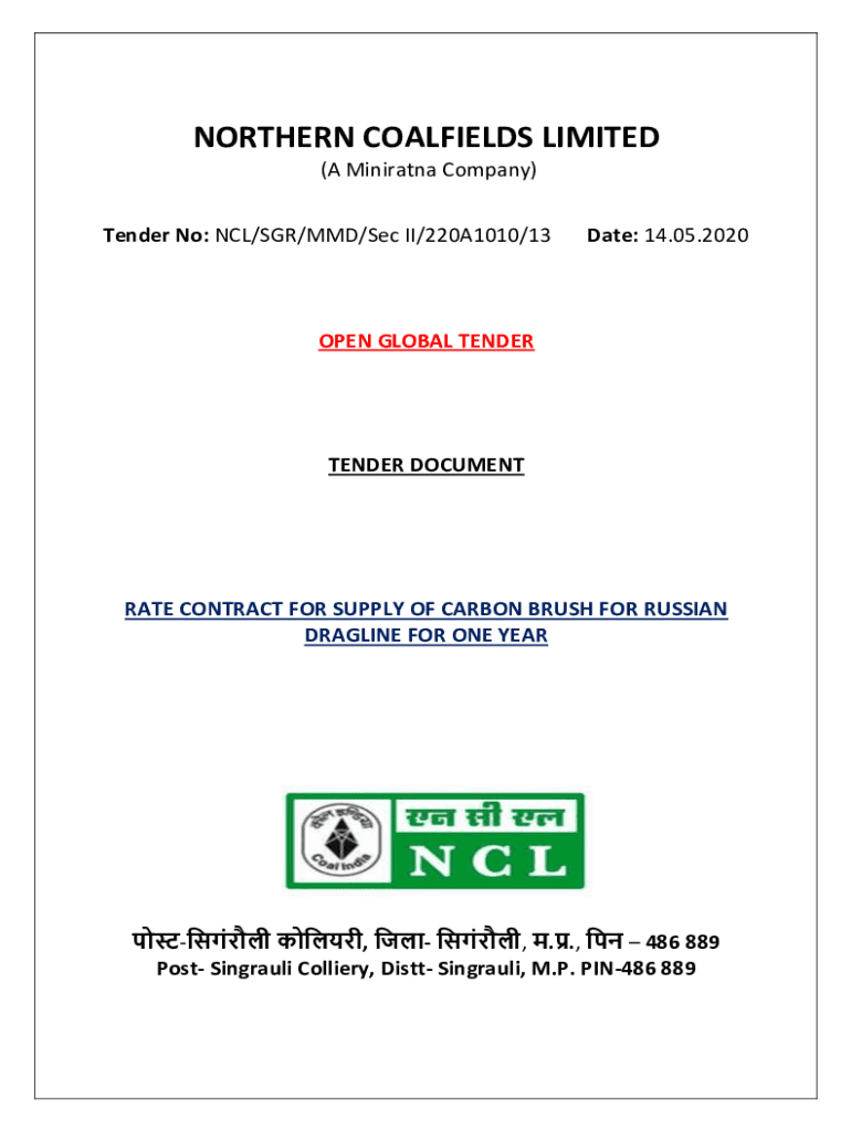 NORTHERN COALFIELDS LIMITED (A Minivan Company) Tender No: NCL/SGR/MID/Sec II/220A1010/13Date: 14.05.2020OPEN GLOBAL TENDERTENDER DOCUMENTARY CONTRACT FOR SUPPLY OF CARBON BRUSH FOR RUSSIAN DEADLINE
