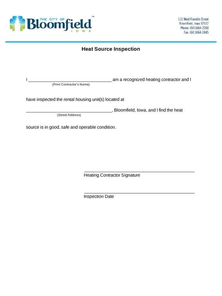 Heat Source Inspection ___ am a recognized heating contractor and I (Print Contractors Name)have inspected the rental housing unit(s) located at ___, Bloomfield, Iowa, and I find the heat (Street