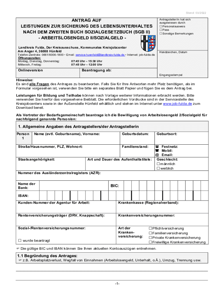 Stand: 03/2022ANTRAG AUF LEISTUNGEN OUR PICKERING DES LEBENSUNTERHALTES EACH DEM SWEETEN SUCH SOZIALGESETZBUCH (SGB II) ARBEITSLOSENGELD II/SOZIALGELD Banduras Full, Her Kreisausschuss, Communal Kreisjobcenter
