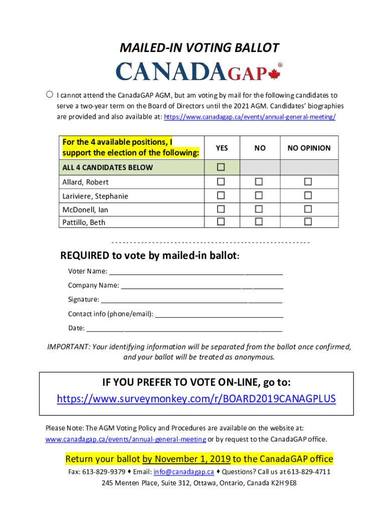MAILED IN VOTING BALLOT I cannot attend the Canada GAP AGM, but am I voting by mail for the following candidates to serve a two-year term on the Board of Directors until the 2021 AGM. Candidates biographies