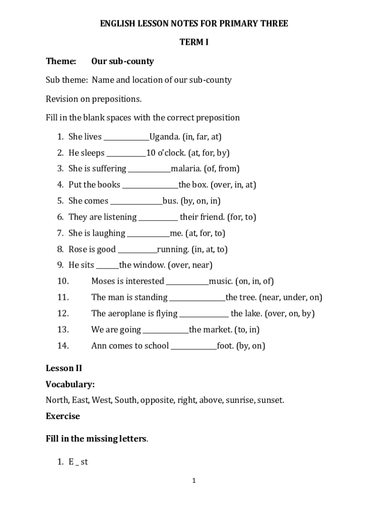 ENGLISH LESSON NOTES FOR PRIMARY THREE Terms I Theme:Our subcountySub theme: Name and location of our subcounty Revision on prepositions. Fill in the blank spaces with the correct preposition 1. She