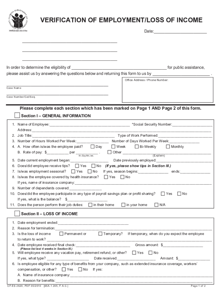 VERIFICATION OF EMPLOYMENT/LOSS OF INCOME Date:___ ___ ___ ___ In order to determine the eligibility of ___ for public assistance, please assist us by answering the questions below and returning this