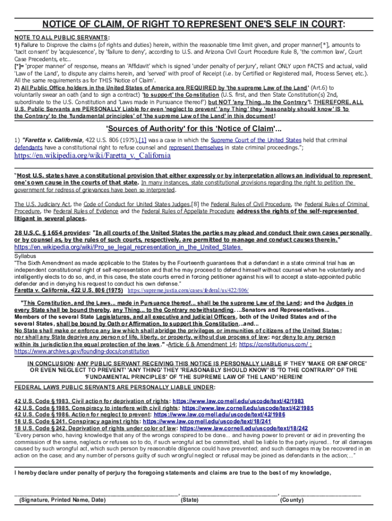 NOTICE OF CLAIM, OF RIGHT TO REPRESENT ONE\'S SELF IN COURT: NOTE TO ALL PUBLIC SERVANTS: 1) Failure to Disprove the claims (of rights and duties) herein, within the reasonable time limit given, and