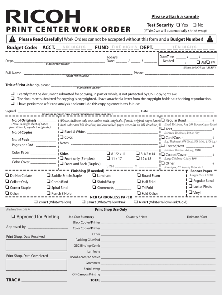 Please attach a samplePRINT CENTER WORK ORDER ! Test Security o Yes No(If Yes, we will automatically shrink wrap)Please Read Carefully! Work Orders cannot be accepted without this form and a Budget