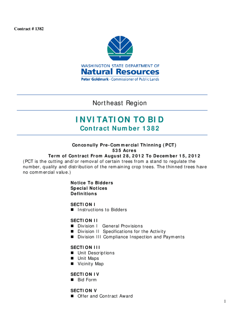 Contract # 1382Northeast RegionINVITATION TO BID Contract Number 1382Conconully Commercial Thinning (PCT) 535 Acres Term of Contract From August 28, 2012, To December 15, 2012 (PCT is the cutting