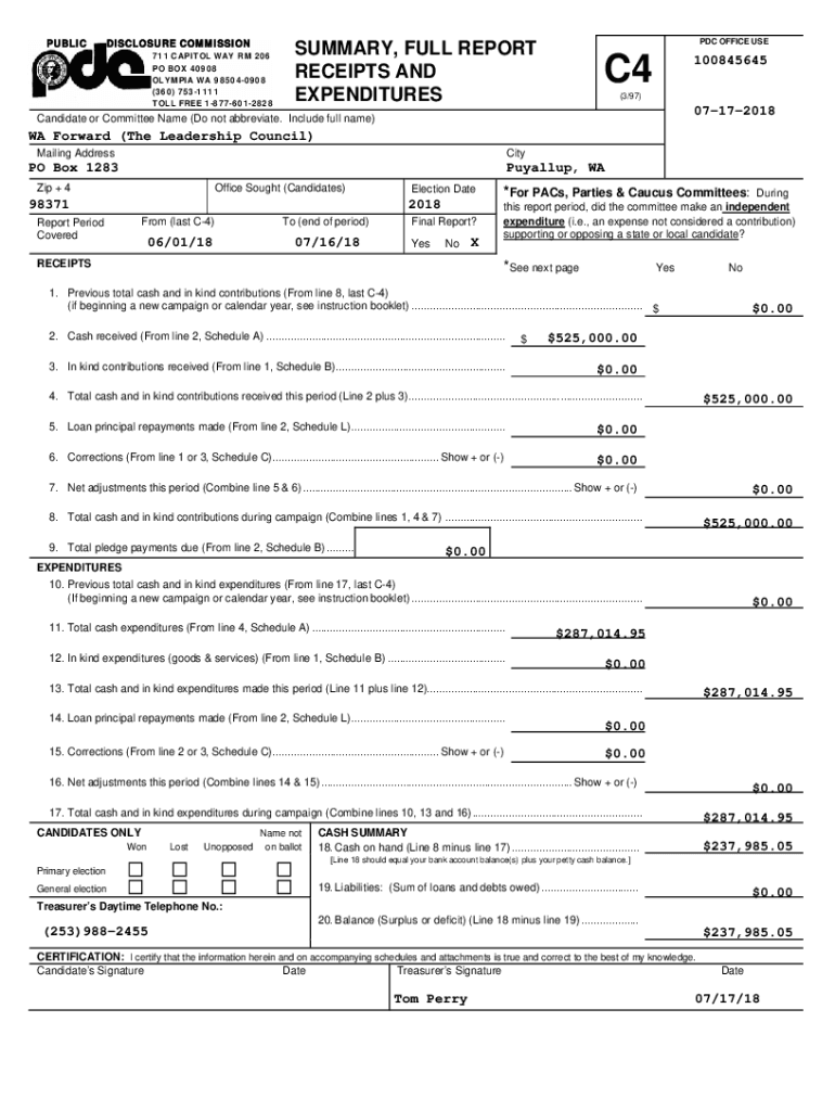 PUBLICDISCLOSURE COMMISSION711 CAPITOL WAY RM 206 PO BOX 40908 OLYMPIA WA 985040908 (360) 7531111 TOLL FREE 18776012828PDC OFFICE SUMMARY, FULL REPORT RECEIPTS AND EXPENDITURESC4100845645(3/97)07172018Candidate