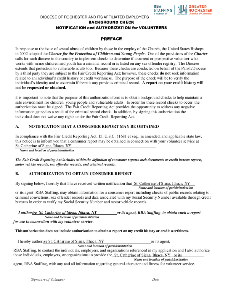 DIOCESE OF ROCHESTER AND ITS AFFILIATED EMPLOYERS BACKGROUND CHECK NOTIFICATION and AUTHORIZATION for VOLUNTEERSPREFACE In response to the issue of sexual abuse of children by those in the employ