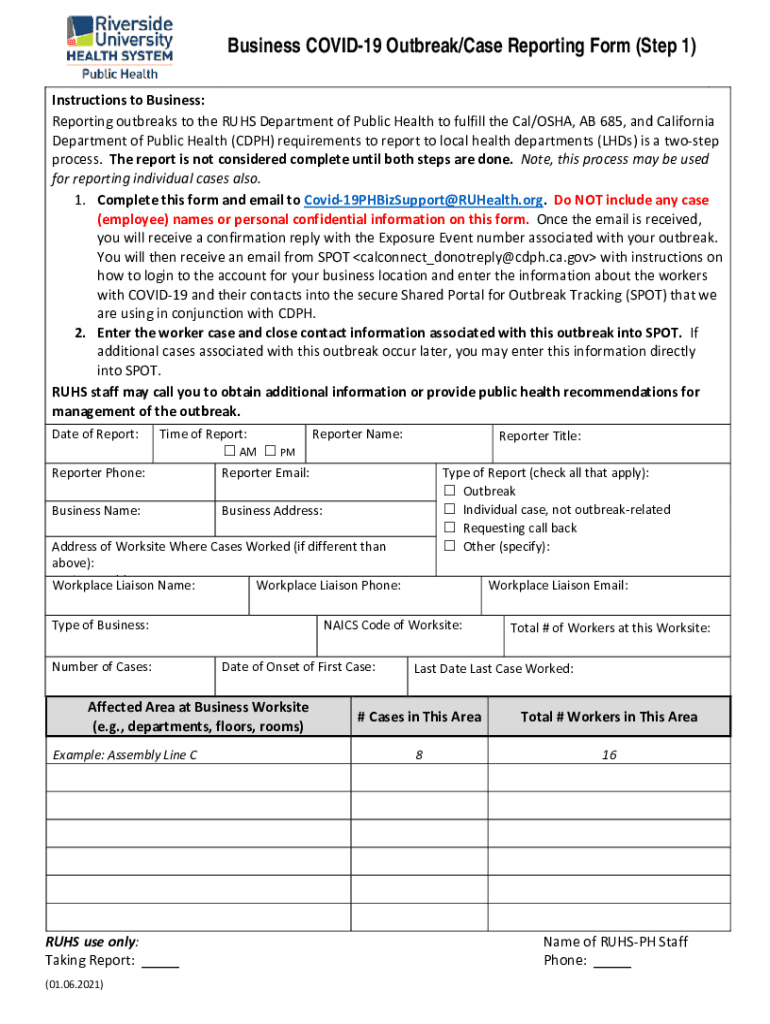 Business COVID-19 Outbreak/Case Reporting Form (Step 1) Instructions to Business: Reporting outbreaks to the RUNS Department of Public Health to fulfill the Cal/OSHA, AB 685, and California Department