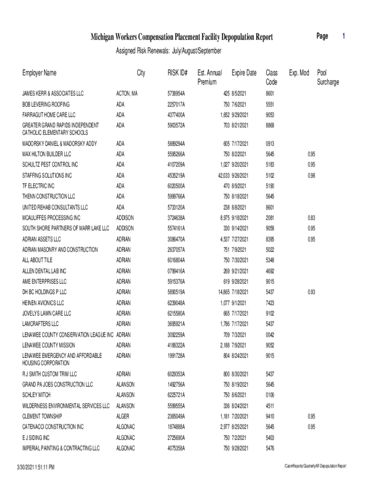Page Michigan Workers Compensation Placement Facility Depopulation Report1Assigned Risk Renewals: July/August/September Employer NameCityRISK ID×Est. Annual PremiumExpire Dateless Codex. Mojaves