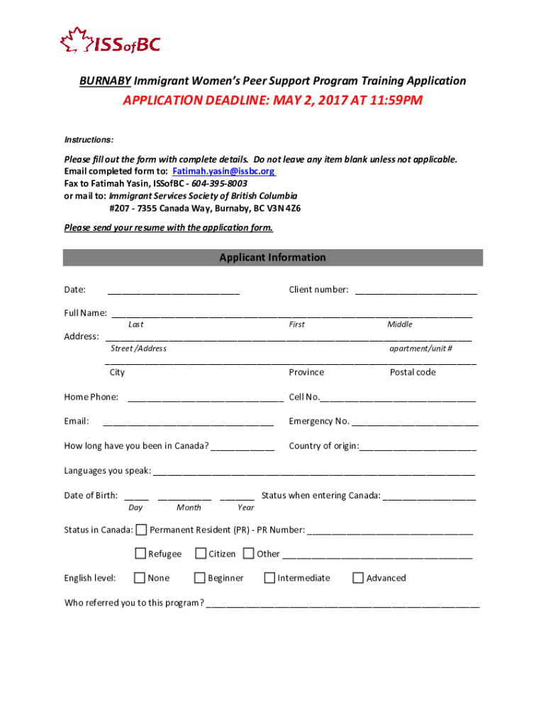 APPLICATION DEADLINE MAY 2, 2017, AT 11:59PM Immigrant Women's Peer Support Program2017 BURNABY SPRING TRAINING APPLICATION Program Summary The Immigrant Women's Peer Support Program provides mental,