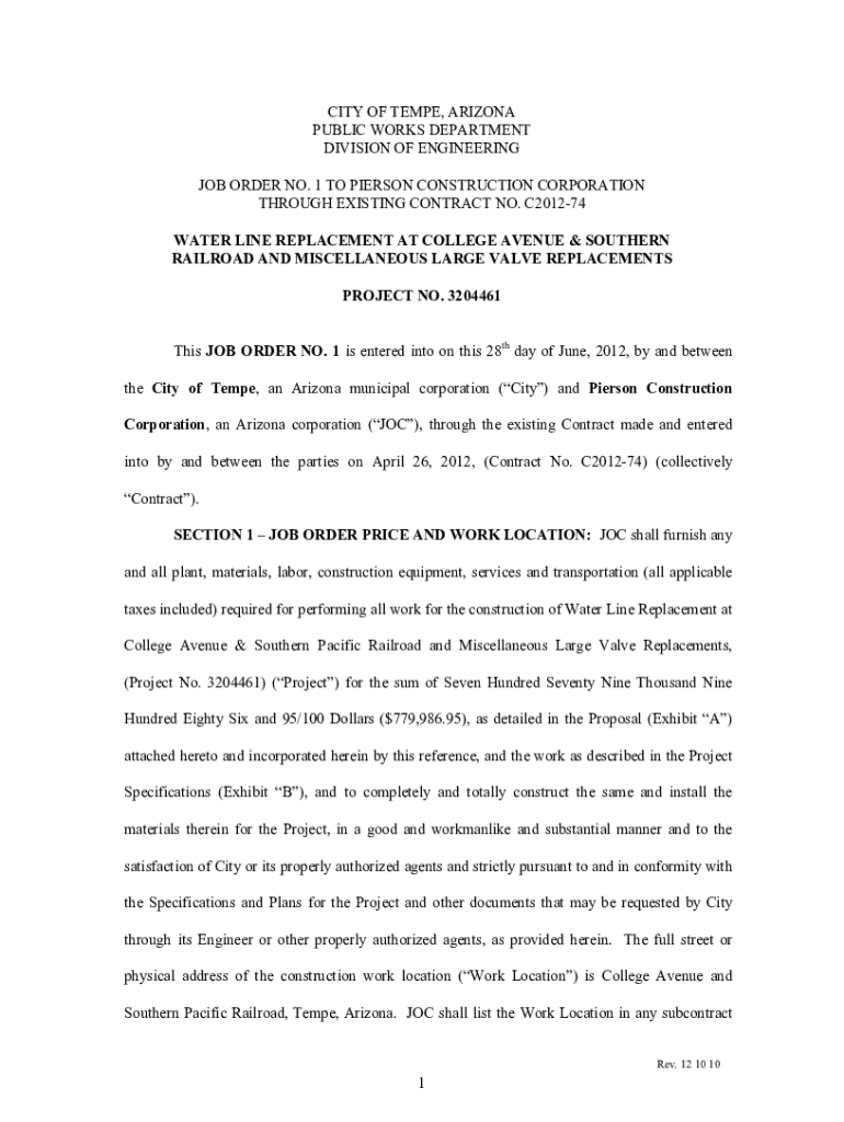 CITY OF TEMPE, ARIZONA PUBLIC WORKS DEPARTMENT DIVISION OF ENGINEERING JOB ORDER NO. 1 TO PIERSON CONSTRUCTION CORPORATION THROUGH EXISTING CONTRACT NO. C201274 WATER LINE REPLACEMENT AT COLLEGE AVENUE