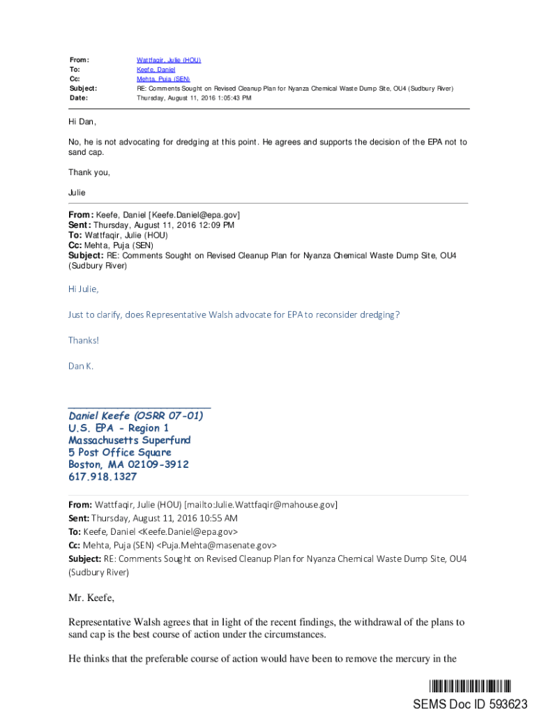 From: To: Cc: Subject: Date:Wayfair, Julie (YOU) Keeffe, Daniel Meta, Pupa (SEN) RE: Comments Sought on Revised Cleanup Plan for Nyanza Chemical Waste Dump Site, OU4 (Sudbury River) Thursday, August