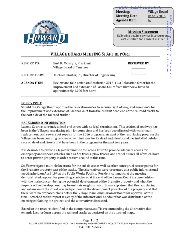 PSC REF#:285470Village Board 04/25/2016 6gMission StatementPublic Service Commission of Wisconsin RECEIVED: 04/29/16, 11:22:10 Meeting: Meeting Date: Agenda Item:Delivering quality services in a courteous,