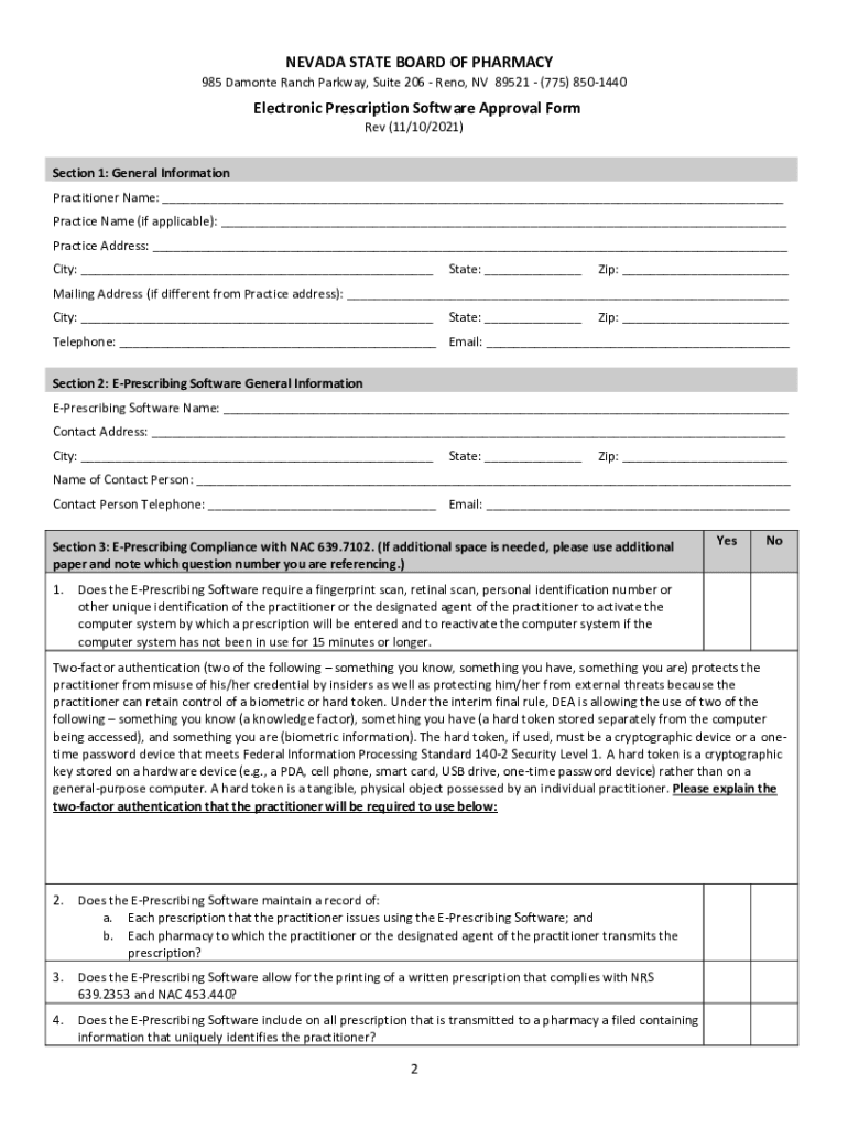NEVADA STATE BOARD OF PHARMACY 985 Monte Ranch Parkway, Suite 206 Reno, NV 89521 (775) 8501440Electronic Prescription Software Approval Form Rev (11/10/2021)NAC 639.7102 states that a computer system