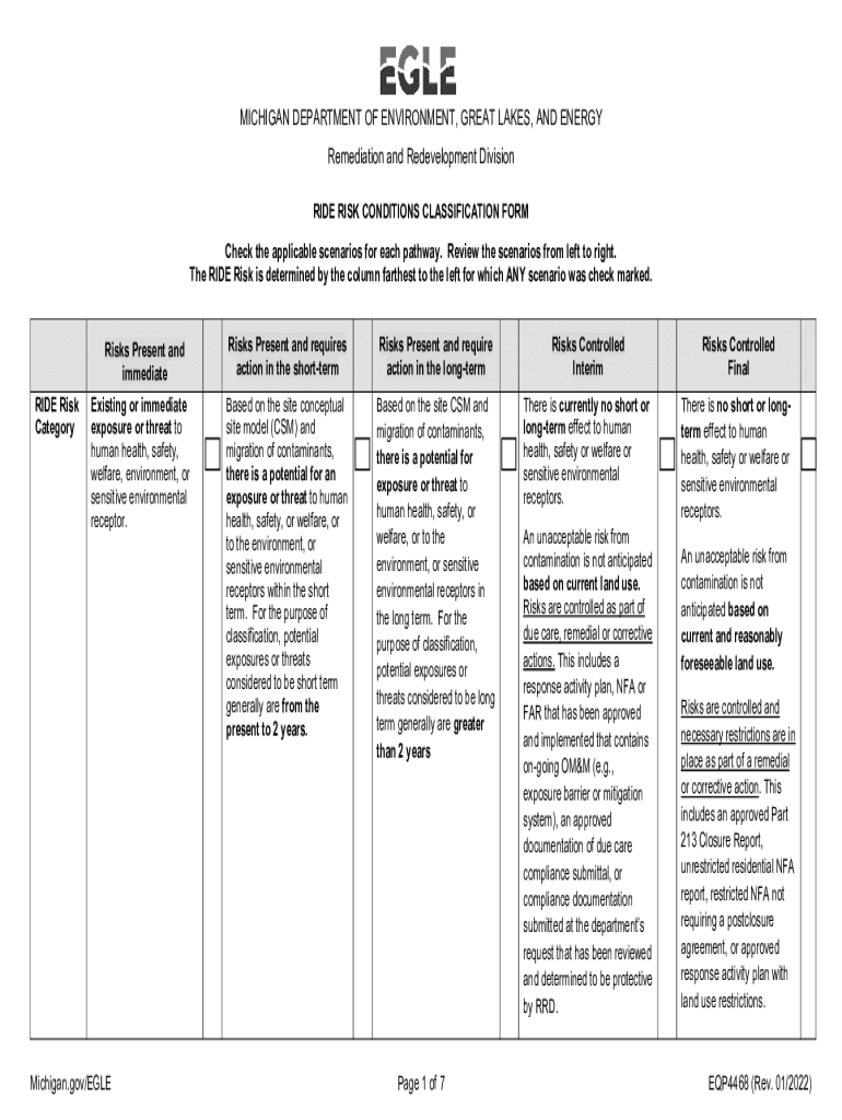 MICHIGAN DEPARTMENT OF ENVIRONMENT, GREAT LAKES, AND ENERGY Remediation and Redevelopment Division RIDE RISK CONDITIONS CLASSIFICATION FORM Check the applicable scenarios for each pathway. Review