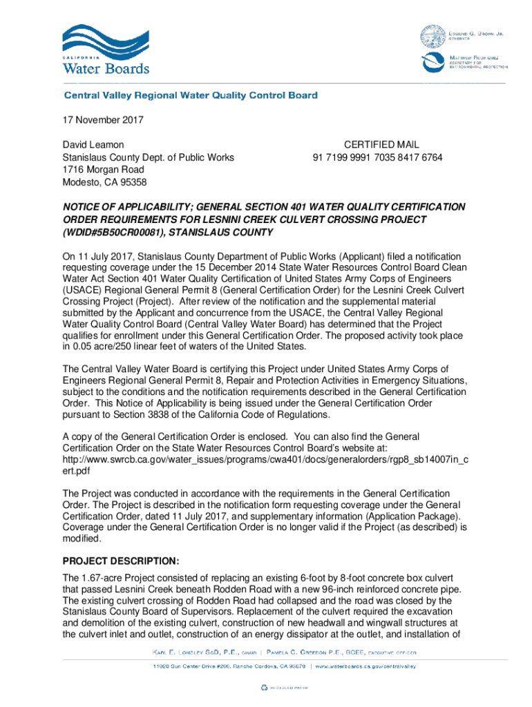 17 November 2017 David Lemon Stanislaus County Dept. of Public Works 1716 Morgan Road Modesto, CA 95358CERTIFIED MAIL 91 7199 9991 7035 8417 6764NOTICE OF APPLICABILITY; GENERAL SECTION 401 WATER