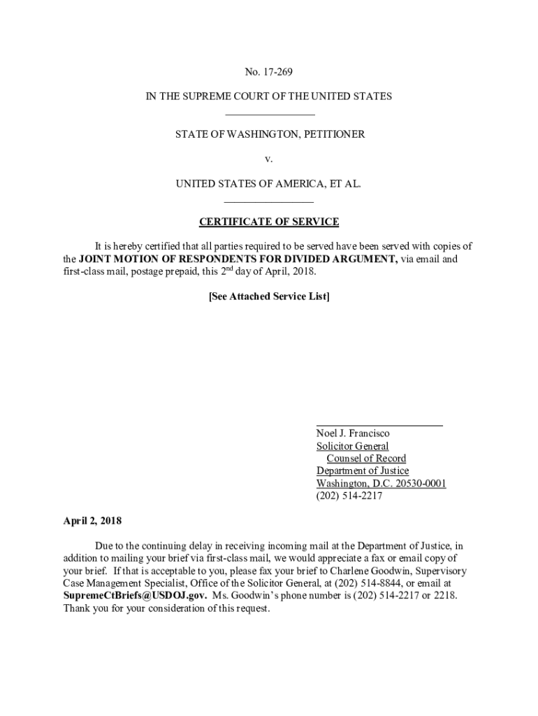 No. 17269 IN THE SUPREME COURT OF THE UNITED STATES ___ STATE OF WASHINGTON, PETITIONER v. UNITED STATES OF AMERICA, ET AL. ___ CERTIFICATE OF SERVICE It is hereby certified that all parties required