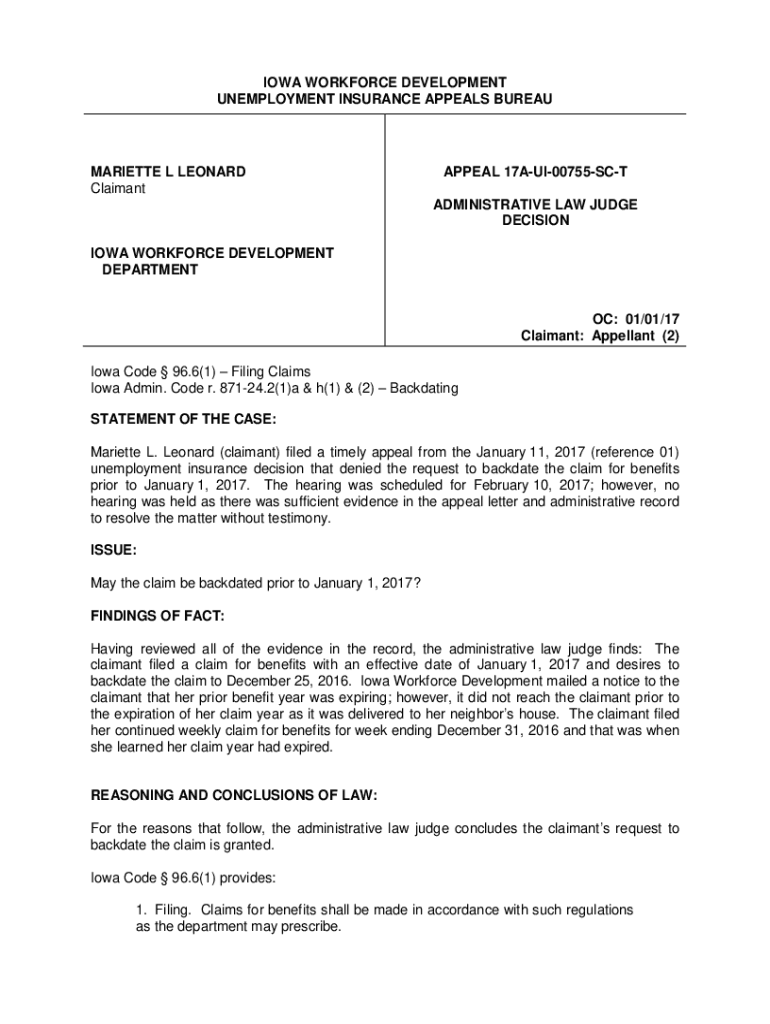 IOWA WORKFORCE DEVELOPMENT UNEMPLOYMENT INSURANCE APPEALS BUREAUMARIETTE L LEONARD ClaimantAPPEAL 17AUI00755SCT ADMINISTRATIVE LAW JUDGE DECISIONING WORKFORCE DEVELOPMENT DEPARTMENT: 01/01/17 Claimant: