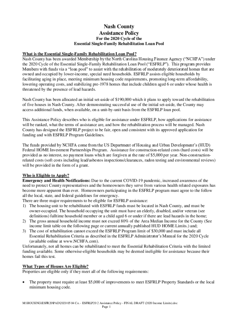 Nash County Assistance Policy For the 2020 Cycle of the Essential SingleFamily Rehabilitation Loan Pool What is the Essential SingleFamily Rehabilitation Loan Pool? Nash County has been awarded Membership