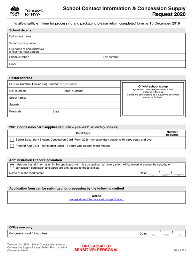 School Contact Information & Concession Supply Request 2020 To allow sufficient time for processing and packaging please return completed form by 13 December 2019 School details Full school name: