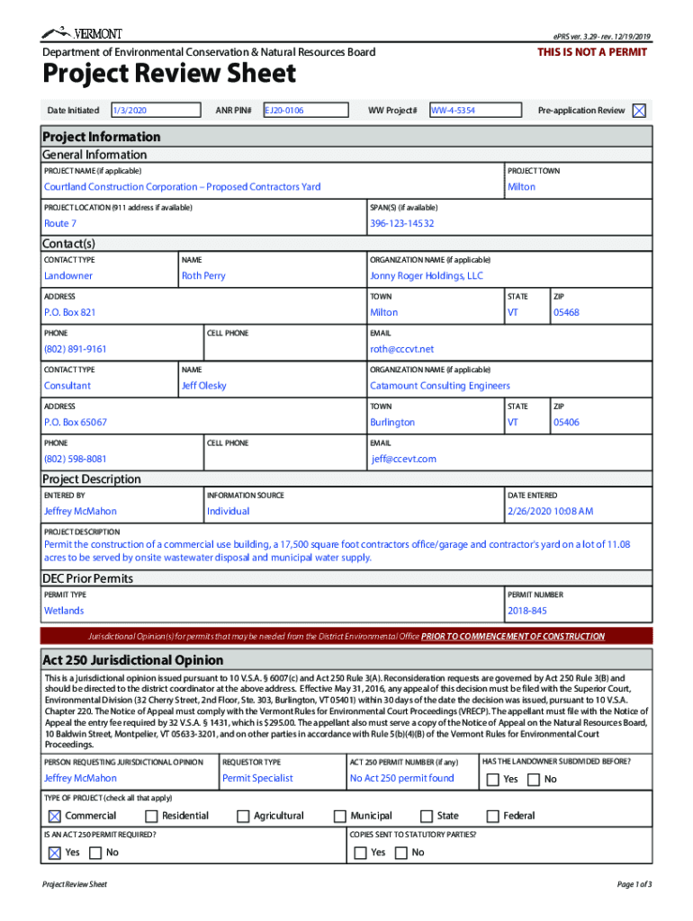 EARS very. 3.29 rev. 12/19/2019Department of Environmental Conservation & Natural Resources Boards IS NOT A PERMITProject Review Sheet Date Initiated1/3/2020ANR PIN×EJ200106WW Project×Reapplication