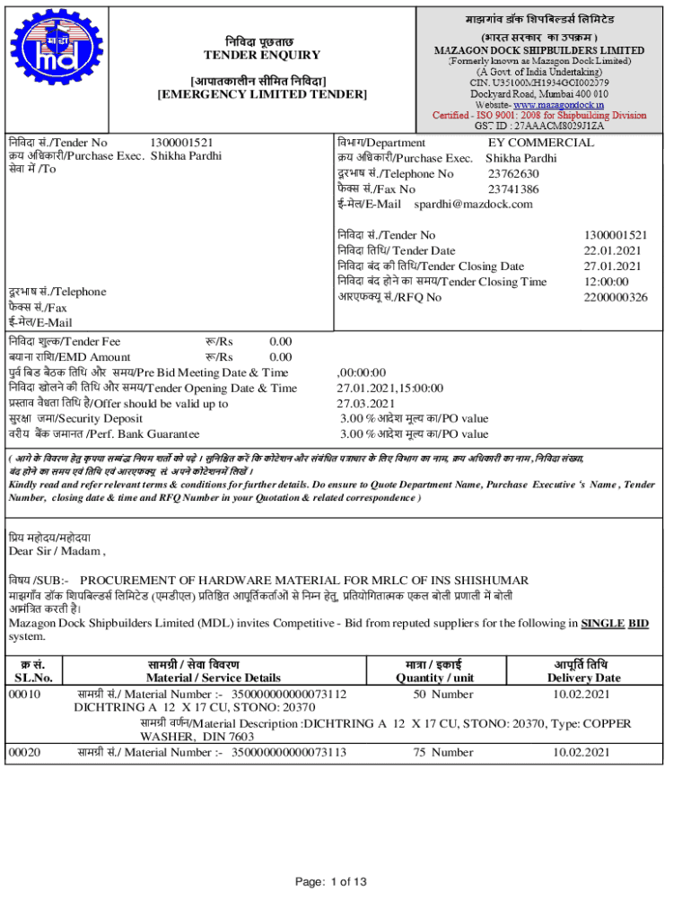 TENDER Inquiry [ ] [EMERGENCY LIMITED TENDER] ./Tender No /Purchase Exec. /To/Department1300001521 Shikhar Parties COMMERCIAL Shikhar Paridhi ./Telephone No 23762630 ./Fax No 23741386 /Email Paridhi×mazdock.com