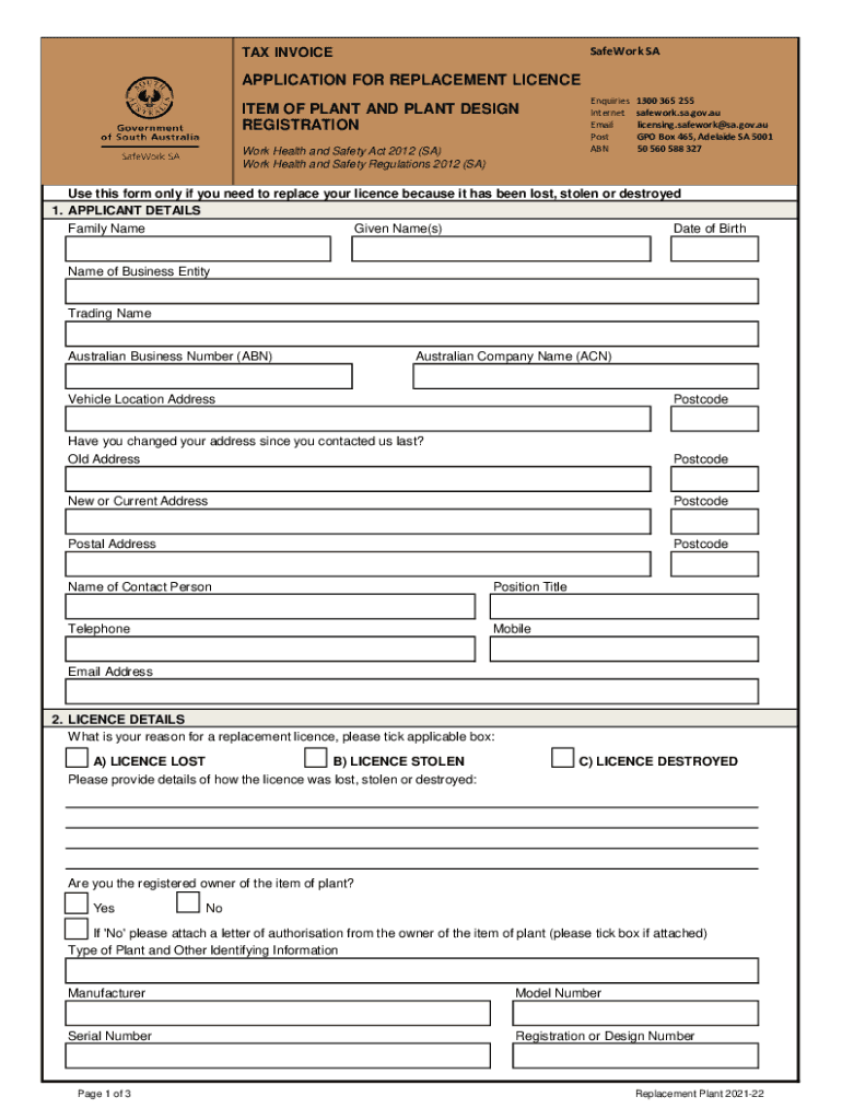 Casework SATAN INVOICEAPPLICATION FOR REPLACEMENT License ITEM OF PLANT AND PLANT DESIGN REGISTRATION Work Health and Safety Act 2012 (SA) Work Health and Safety Regulations 2012 (SA)Inquiries Internet