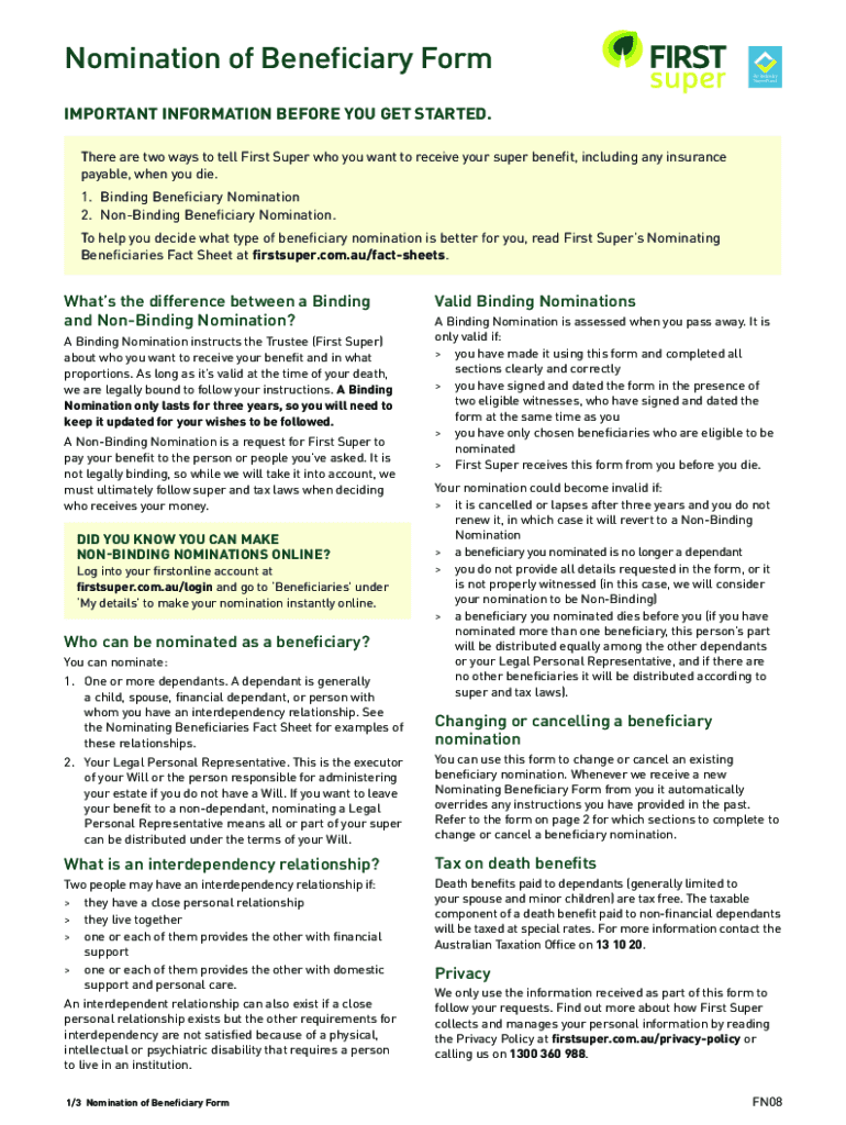 Nomination of Beneficiary Form IMPORTANT INFORMATION BEFORE YOU GET STARTED. There are two ways to tell First Super who you want to receive your super benefit, including any insurance payable, when