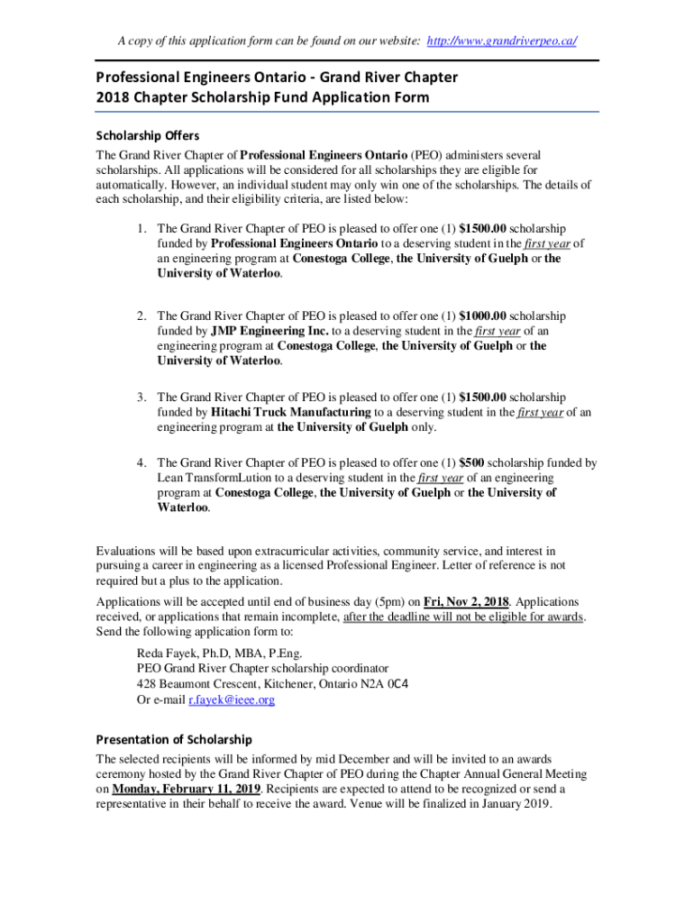 A copy of this application form can be found on our website: http://www.grandriverpeo.ca/Professional Engineers Ontario Grand River Chapter 2018 Chapter Scholarship Fund Application Form Scholarship