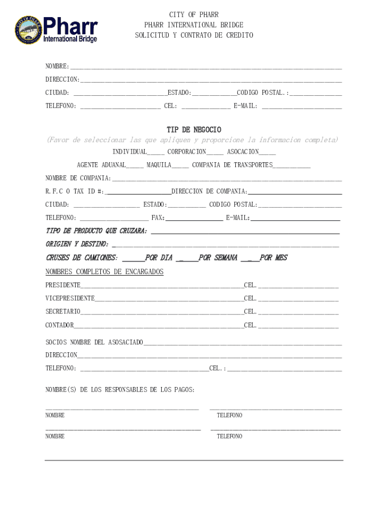 CITY OF PARR INTERNATIONAL BRIDGE SOLICITED Y CONTRALTO DE CREDITONOMBRE:___ DIRECTION:___ CIUDAD: ___ESTATE:___CONGO POSTAL.:___ TELEGONY: ___ CEL: ___ EMAIL: ___TIP DE NEGATION(Favor DE selection