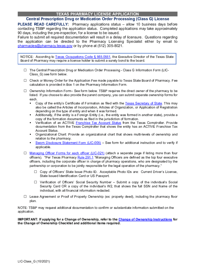 Get the free www.pharmacy.texas.govLIC-ClassG-CHOWTEXAS PHARMACY LICENSE APPLICATION Central Pres...