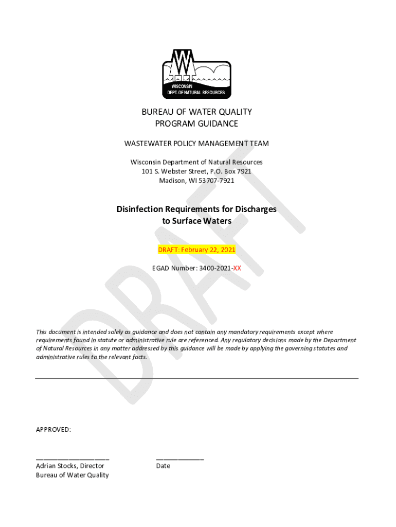 BUREAU OF WATER QUALITY PROGRAM GUIDANCE WASTEWATER POLICY MANAGEMENT TEAM Wisconsin Department of Natural Resources 101 S. Webster Street, P.O. Box 7921 Madison, WI 537077921Disinfection Requirements