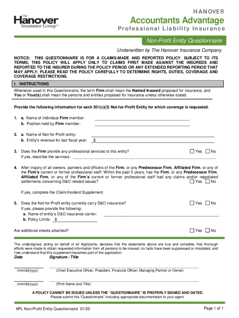 H A N OVER Accountants Advantage Professional Liability Insurance Nonprofit Entity Questionnaire Underwritten by The Hanover Insurance Company NOTICE: THIS QUESTIONNAIRE IS FOR A CLASSMATE AND REPORTED