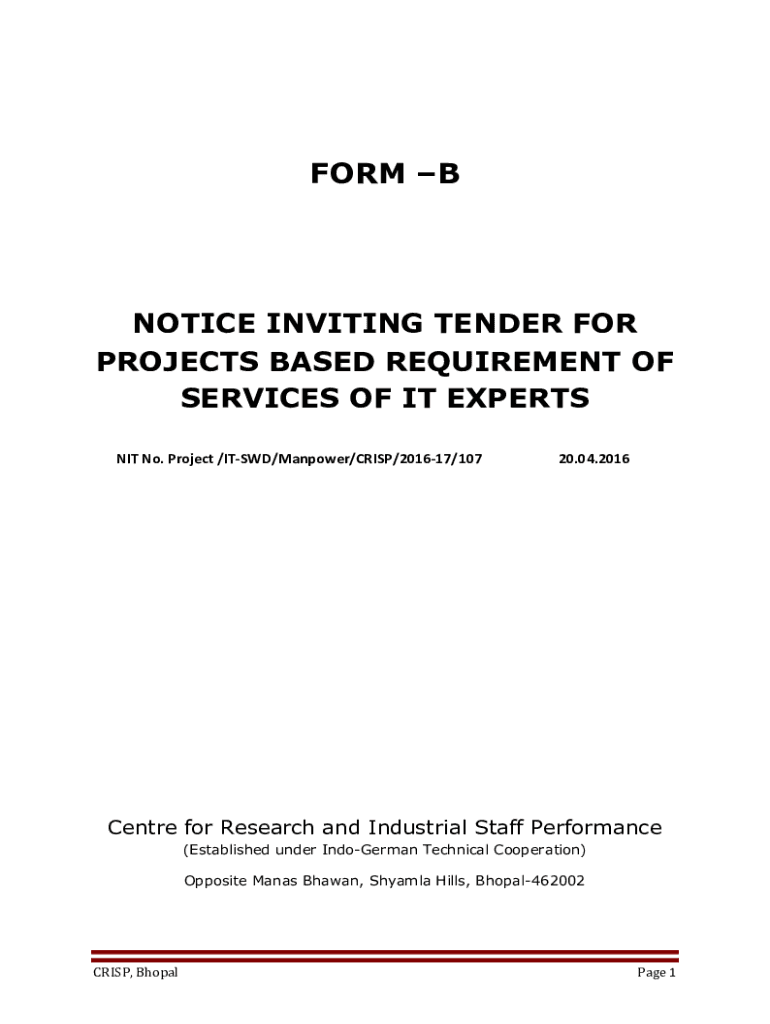 FORM NOTICE INVITING TENDER FOR PROJECTS BASED REQUIREMENT OF SERVICES OF IT EXPERTS NIT No. Project /ITS WD/Manpower/CRISP/201617/10720.04.2016Centre for Research and Industrial Staff Performance