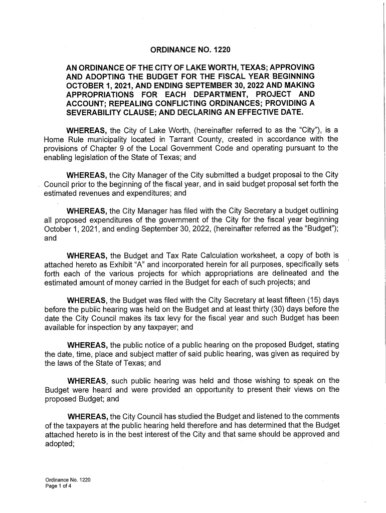 Get the free Budget and Tax OrdinancesLake Worth, Texas